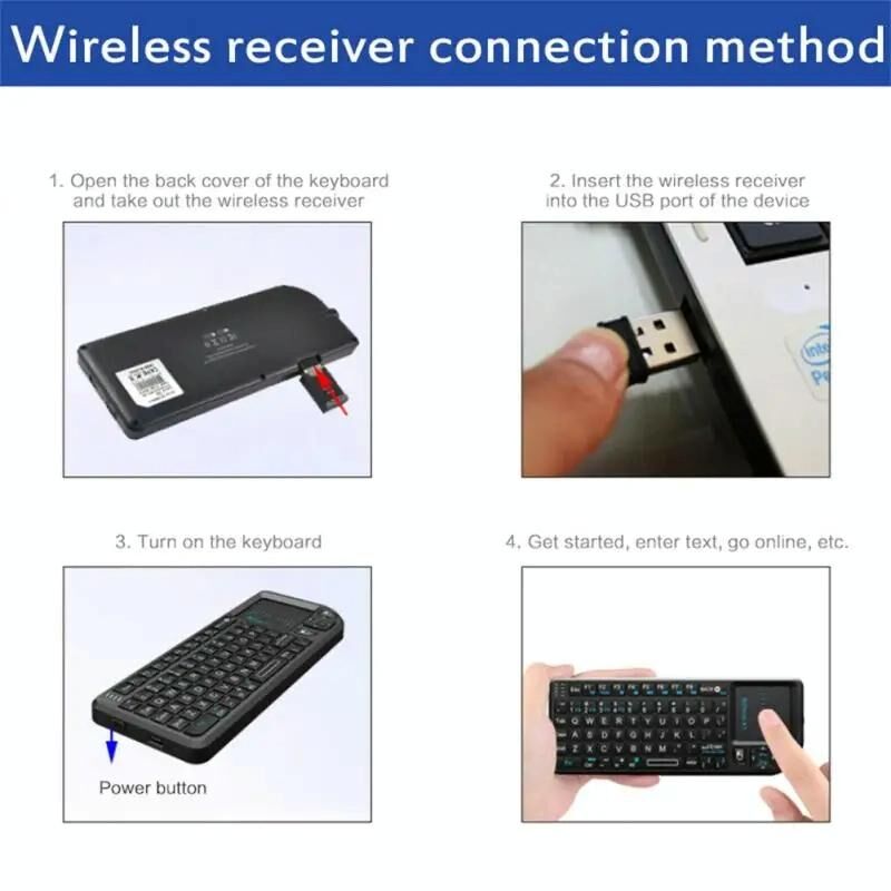 7. Μέθοδος σύνδεσης ασύρματου δέκτη: πρώτα ανοίξτε το πίσω κάλυμμα του πληκτρολογίου για να βγάλετε τον ασύρματο δέκτη, στη συνέχεια εισαγάγετε τον ασύρματο δέκτη στη θύρα USB της συσκευής και στη συνέχεια πατήστε το κουμπί λειτουργίας για να ανοίξετε το πληκτρολόγιο για χρήση