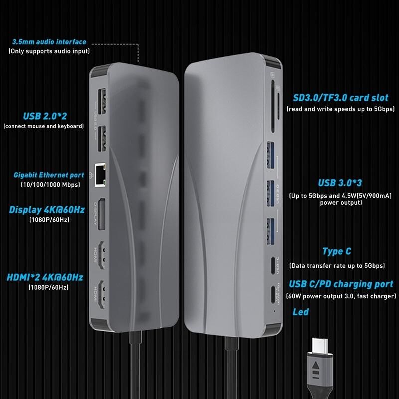 3. Διεπαφή Type-C: Το Type-C1 μπορεί να χρησιμοποιηθεί για φόρτιση PD60W και μεταφορά δεδομένων, το Type-C2 χρησιμοποιείται μόνο για μεταφορά δεδομένων και ο ρυθμός μπορεί να φτάσει τα 5Gbps