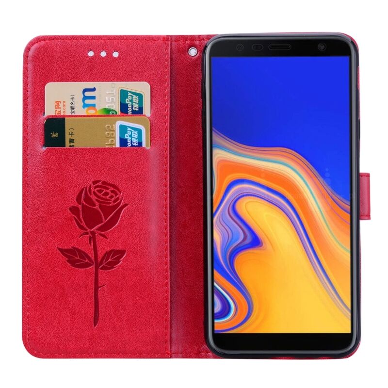 Rose Embossed Horizontal Flip PU Leather Case for Samsung Galaxy J4 Plus, με θήκη για κάρτες & υποδοχές & πορτοφόλι (κόκκινο)
