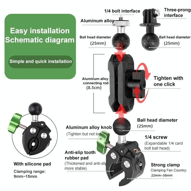 3. Η σφιγκτήρας διπλής κεφαλής υποστηρίζει τιμόνια, διασταυρούμενες ράβδους, μπαστούνια selfie κ.λπ. με διάμετρο 22-38mm.