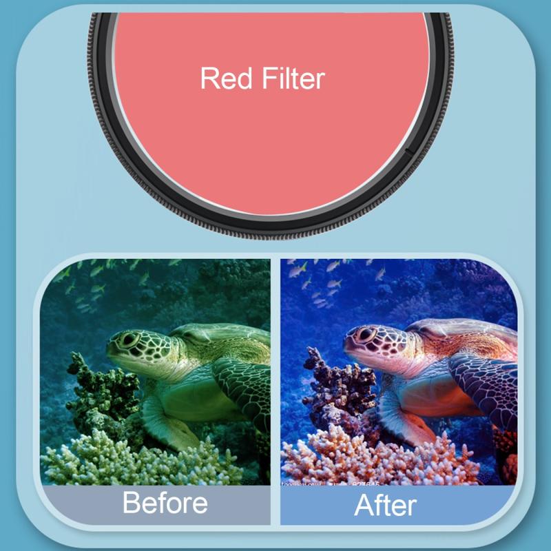 - Κόκκινο φίλτρο: Το κόκκινο φίλτρο μπορεί να χρησιμοποιηθεί γύρω στο μεσημέρι (άμεσο ηλιακό φως στην επιφάνεια του νερού) σε βάθος νερού 10-20 μέτρων, ο κύριος σκοπός είναι να μειωθεί το κόκκινο που απορροφάται από το νερό, να βελτιωθεί αποτελεσματικά το μπλε φαινόμενο της υποβρύχιας λήψης, να αποκατασταθεί η χρωματική ισορροπία, να αποφευχθεί η λήψη εικόνων που είναι πολύ μπλε ή πολύ πράσινες.