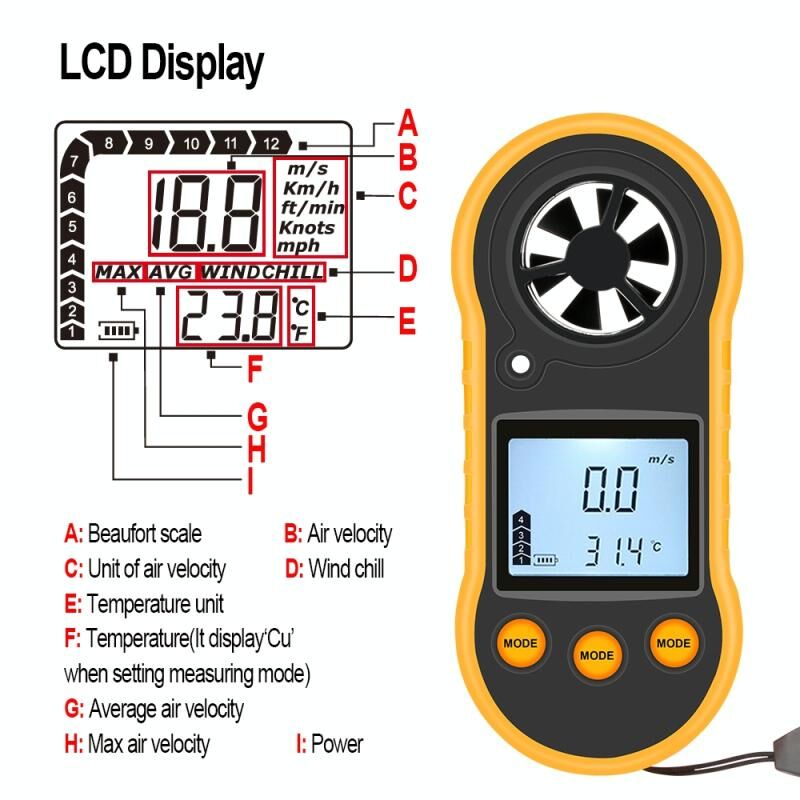 1. Εύρος: 0-30 m/s, 0-90 km/h, 0-5860 ft/min, 0-65 mph, 0-55 κόμβοι.