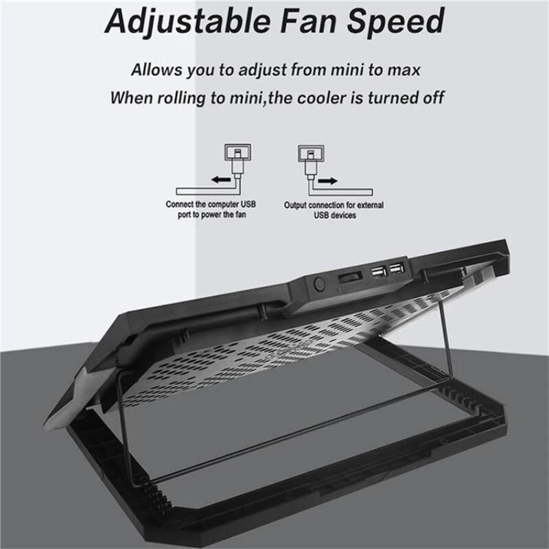 2. Adjustable Height Levels: Featuring six leves adjustable height settings, this cooling stand allows you to position your laptop at the perfect angle, whether upright or flat. Equipped with two anti-slip baffles, it ensures your laptop stays securely in place, preventing sliding or falling off. This versatile accessory functions as both a cooling pad and a practical laptop stand