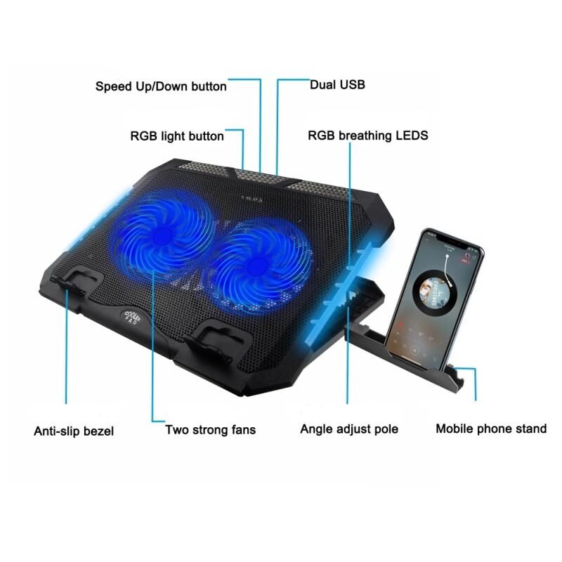 2. Dual Efficient Fans:The laptop cooling stand has two large fans of 14CM, the fan is equipped with blue LED lights, working voltage: 5V, current: 0.35A, USB cable length: 50 cm.