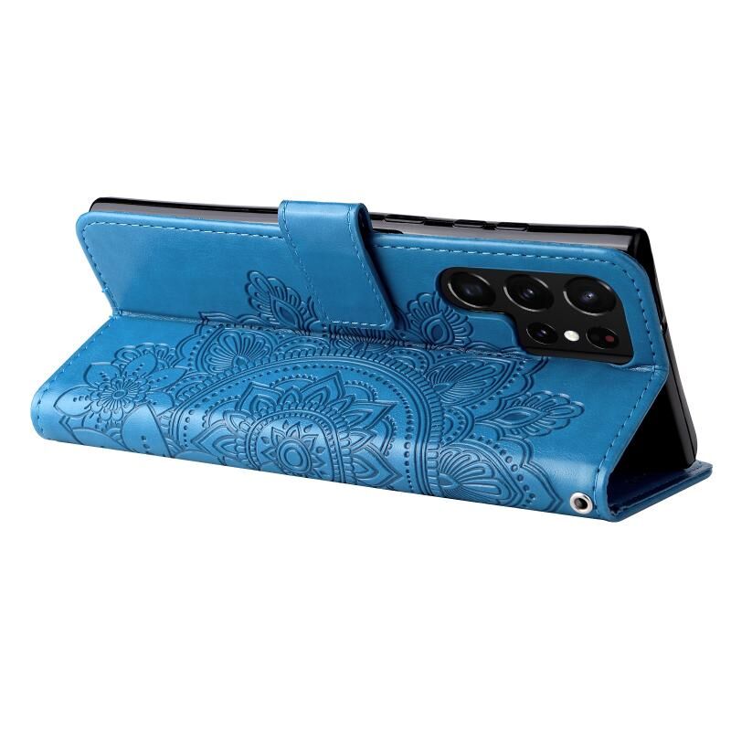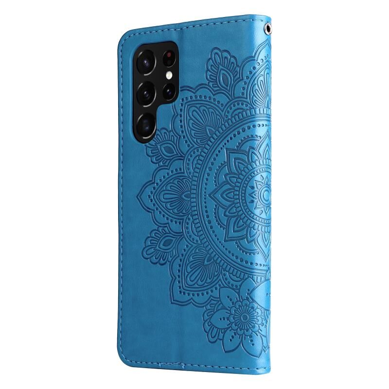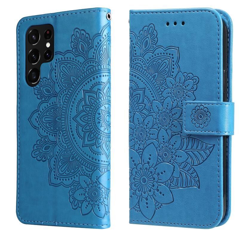 Samsung Galaxy S22 UItra 5G 7-πέταλο λουλούδια ανάγλυφο Flip δερμάτινη θήκη τηλεφώνου με θήκη & υποδοχές για κάρτες (μπλε)