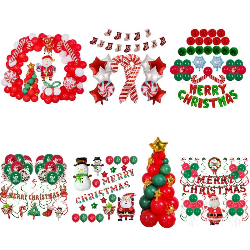 12. Pull the flag 1 specification: 12-inch printed santa claus balloon x 10+12-inch printed christmas tree balloon x 10+12-inch red and green sequined balloon x 10+mini christmas gift x 1+cane x 1+christmas tree x 1+christmas stocking x 1+christmas snowman x 1+red and green mixed color spiral x 2 packs+Letter pull flag x 1 set+straw x 1+dispensing x 1+ribbon x 1+balloon chain x 1