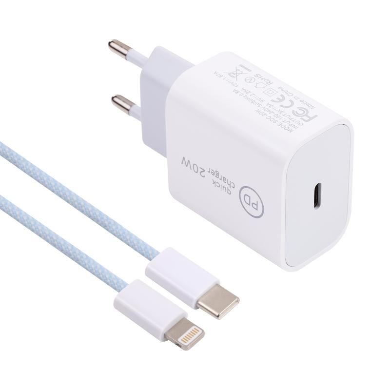 Φορτιστής Ταξιδίου PD USB-C / Type-C 20W + Σετ Καλωδίου Δεδομένων 1μ 20W USB-C / Type-C σε 8 ακίδες, Ευρωπαϊκό Βύσμα (Ροζ)