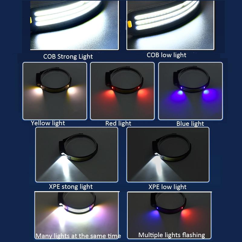 7. Gears: COB strong light - COB weak light - yellow light - red light - blue light - XPE strong light - XPE weak light - multiple lights on at the same time - multiple lights flashing