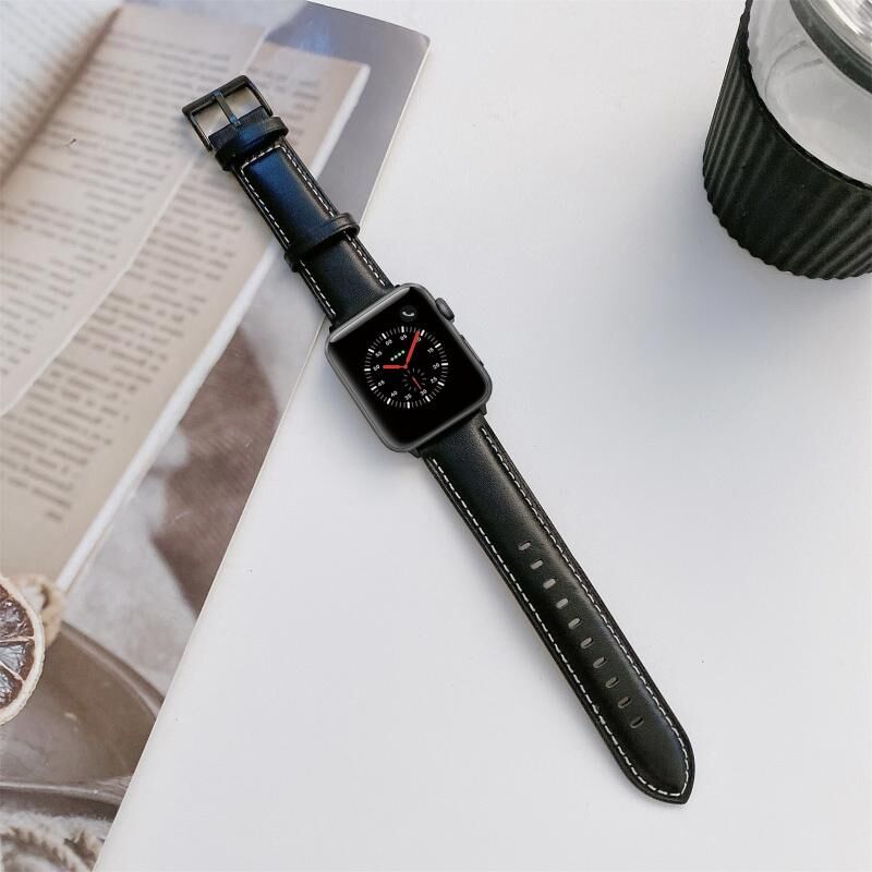 Ραφτό Δερμάτινο Λουράκι για Apple Watch Series 9&8&7 41mm / SE 3&SE 2&6&SE&5&4 40mm / 3&2&1 38mm (Μαύρο)