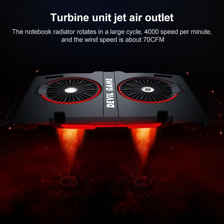 1. Turbine unit, jet-type wind, 4000 speed per minute, wind speed and air volume about 70CFM, powerful cooling, so that the laptop is no longer hot