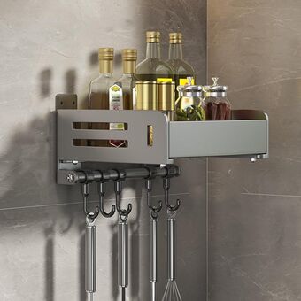 Wall Mounted Kitchen Spice Rack Carbon Steel Bathroom Storage Shelf Towel Rack 20cm With Hooks