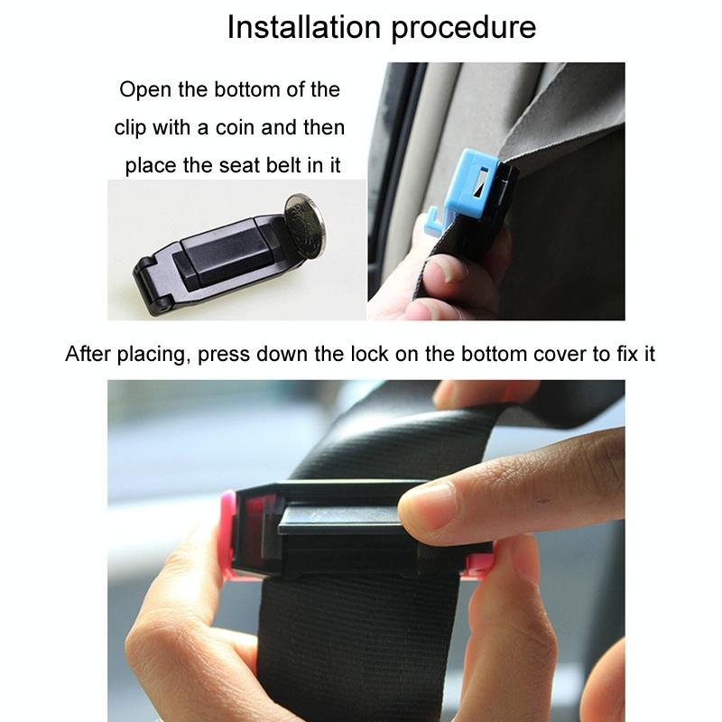 1. Use a coin to open the bottom cover of the clip, and then put the safety belt into it