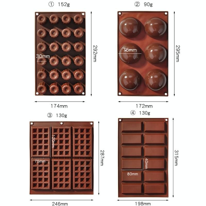 5. Μέγεθος: καλούπι για πουτίγκα 295 x 172 x 35mm, καλούπι για κέικ 292 x 174 x 30mm, καλούπι για βάφλα 287 x 246 x 15mm, καλούπι για σοκολάτα 315 x 198 x 15mm