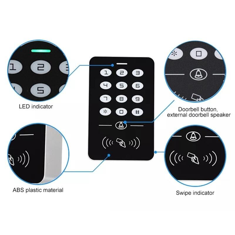 7. Αυτό το προϊόν είναι μια ολοκληρωμένη μηχανή ελέγχου πρόσβασης με κάρτα επαγωγής χωρίς επαφή και κωδικό πρόσβασης. Είναι απλό στη χρήση και αξιόπιστο στην απόδοση. Υποστηρίζει άνοιγμα της πόρτας με σάρωση κάρτας, με κωδικό πρόσβασης και με κάρτα και κωδικό πρόσβασης. Σήμα PUSH (χαμηλό επίπεδο) από ομάδα σε γείωση, μία θύρα για κουμπί εξόδου, μία θύρα για κουδούνι.