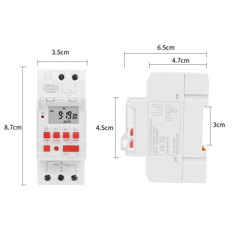 TM919B (φορτίο 30Amp) χρονοδιακόπτης DIN rail 7 ημερών 24 ωρών, προγραμματιζόμενος, μπορεί να ενεργοποιεί και να απενεργοποιεί αυτόματα διάφορες ηλεκτρικές συσκευές σε προκαθορισμένες ώρες. Χρησιμοποιείται ευρέως για προγραμματιζόμενο έλεγχο 7 ημερών σε φώτα δρόμου, φώτα νέον, πινακίδες, λάμπες, θερμοσίφωνες, κλιματιστικά, διαφημιστικές πινακίδες, ηλεκτρικές κουζίνες ρυζιού, ενισχυτές, ψεκαστήρες, μηχανές εμφιάλωσης, προθερμαστές, γεωργικές εγκαταστάσεις και εξοπλισμό μετάδοσης. Ενσωματωμένη επαναφορτιζόμενη μπαταρία 1.2V/40mA για αποθήκευση προγραμμάτων σε περίπτωση διακοπής ρεύματος. Έχει τα χαρακτηριστικά χαμηλής κατανάλωσης ενέργειας, υψηλής ακρίβειας τσιπ CMOS, ισχυρής αντιπαρεμβολής και απλής ρύθμισης. Προδιαγραφές: 1. Τροφοδοσία: AC220V/DC24V /DC12V / DC5V / AC85-265V/AC110V 2. Επαφή διακόπτη: 1 διακόπτης 3. Πρόγραμμα: Ενεργοποίηση/απενεργοποίηση 16 φορές την ημέρα ή την εβδομάδα 4. Ελάχιστο διάστημα: 1 λεπτό 5. Εύρος χρονισμού: 1 λεπτό~168 ώρες 6. Μέσο σφάλμα: 1 δευτερόλεπτο/24 ώρες, 25 βαθμοί Κελσίου