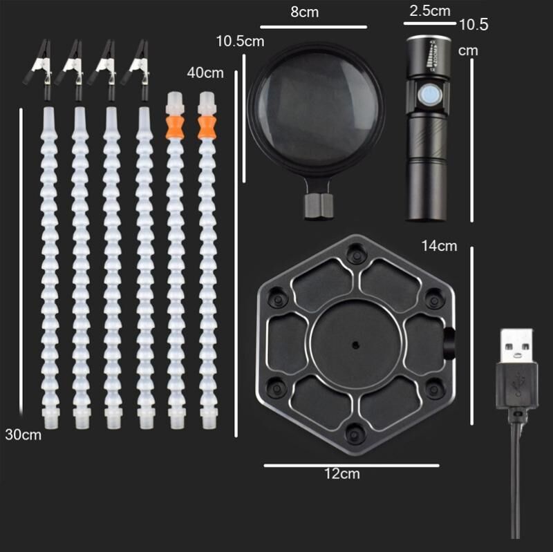 9. Dimensions: auxiliary arm 30 cm, 40 cm; flashlight 2.5x10.5 cm, magnifying glass 10.5x8.5 cm; base 12x140 cm