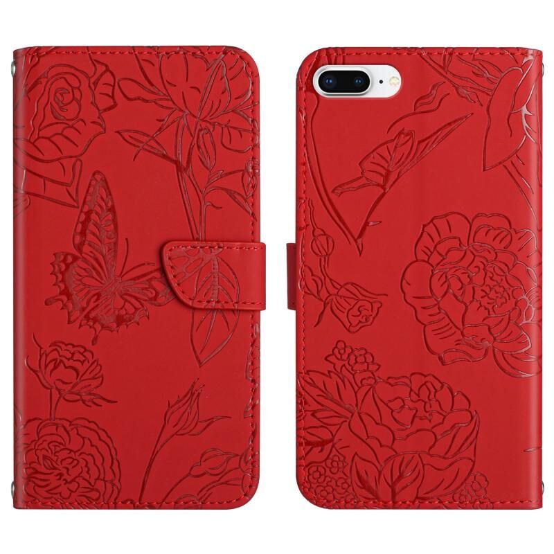 Θήκη τηλεφώνου από δέρμα με ανάγλυφο σχέδιο πεταλούδας και παιώνιας για iPhone 8 Plus / 7 Plus (Κόκκινο)