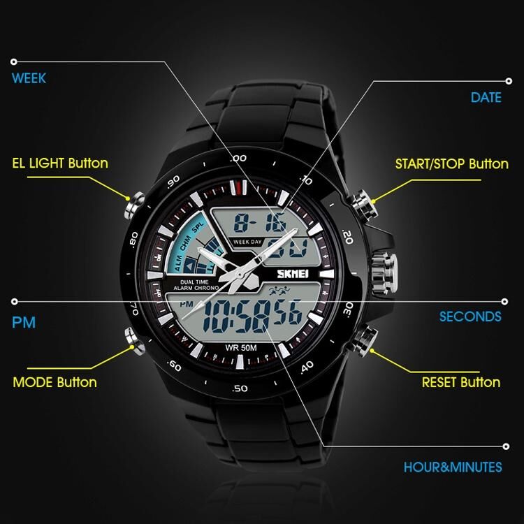 5. Function: stopwatch timing, luminous, display date, dual time display, timed alarm, display week