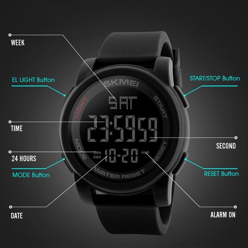 1. Λειτουργίες: Εμφάνιση ώρας, χρονόμετρο, νυχτερινό φως, εμφάνιση ημερομηνίας, ξυπνητήρι, αντίστροφη μέτρηση