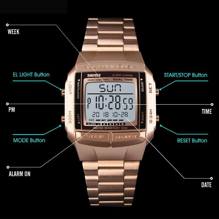 5. Λειτουργία: διπλή ένδειξη ώρας, χρονομέτρηση, ένδειξη ημερομηνίας, χρονικός συναγερμός, ένδειξη ημέρας, νυχτερινό φως, σύστημα 12/24 ωρών, αντίστροφη μέτρηση, ωριαία σήμανση
