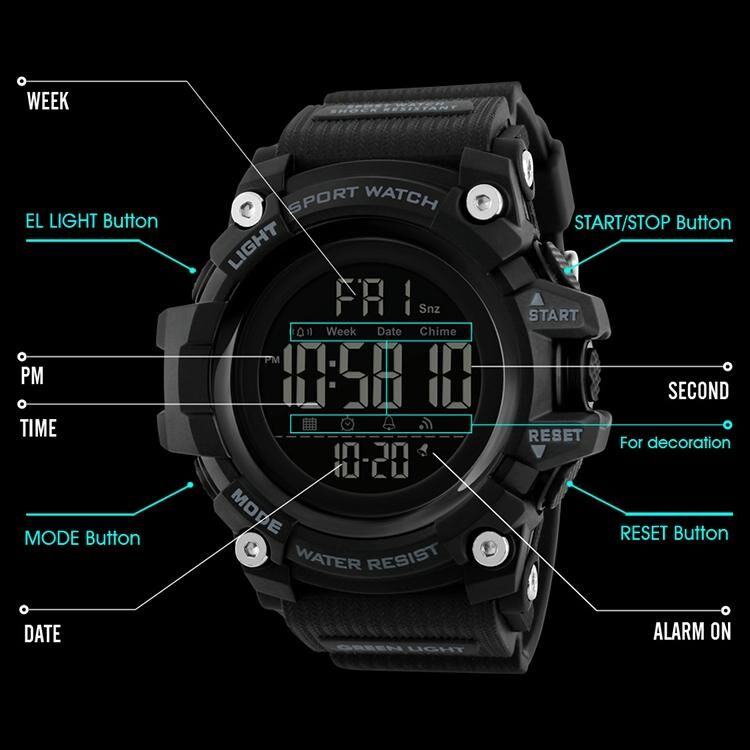 5. Λειτουργία: διπλή εμφάνιση ώρας, χρονομέτρηση, εμφάνιση ημερομηνίας, χρονόμετρο συναγερμού, εμφάνιση ημέρας, νυχτερινό φως, σύστημα 12/24 ωρών, αντίστροφη μέτρηση, ωριαία ένδειξη ώρας