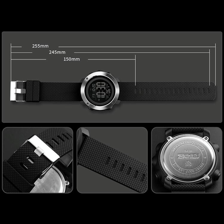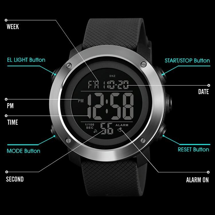 5. Λειτουργία: διπλή εμφάνιση ώρας, χρονομέτρηση, εμφάνιση ημερομηνίας, χρονόμετρο συναγερμού, εμφάνιση ημέρας, νυχτερινό φως, σύστημα 12/24 ωρών, αντίστροφη μέτρηση, ωριαία σήμανση