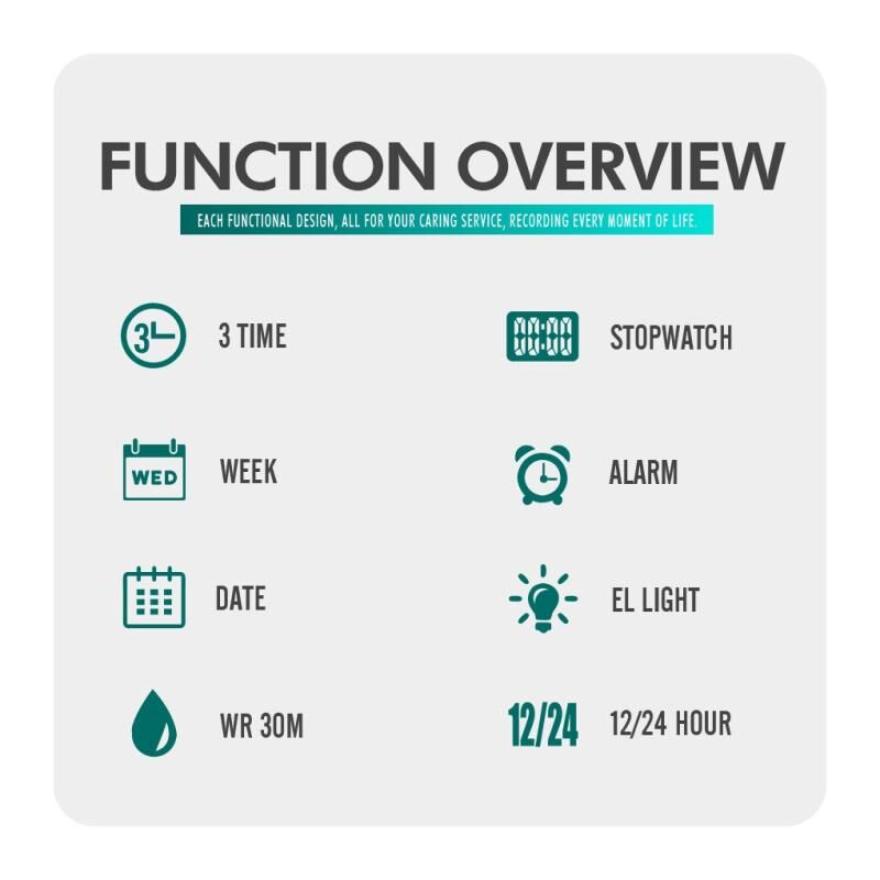 3. Ειδικές λειτουργίες: φωτεινότητα, ένδειξη ημέρας, ξυπνητήρι, χρονογράφος, 3 ρυθμίσεις ώρας, ηωραίο σήμα, σύστημα 12/24 ωρών