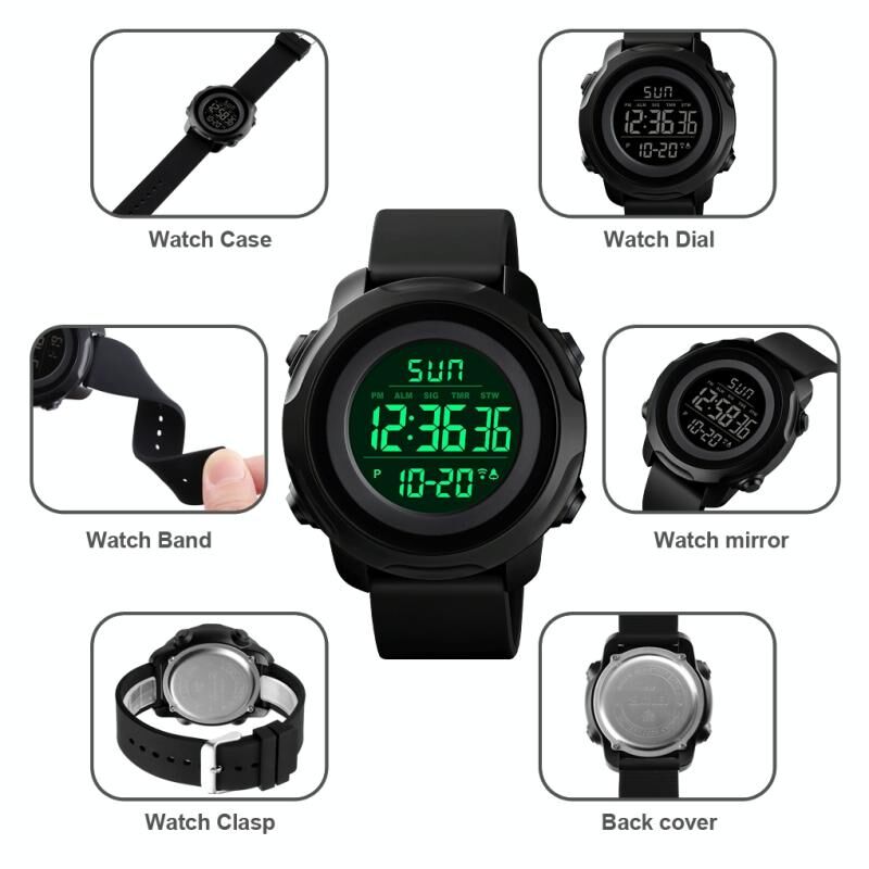 2. Ειδικές λειτουργίες: νυχτερινός φωτισμός, GMT διπλή ώρα, εβδομαδιαία εμφάνιση, ξυπνητήρι, χρονόμετρο, αντίστροφη μέτρηση, μηνιαία εμφάνιση, αναφορά ώρας ταυτόχρονα, σύστημα 12/24 ωρών