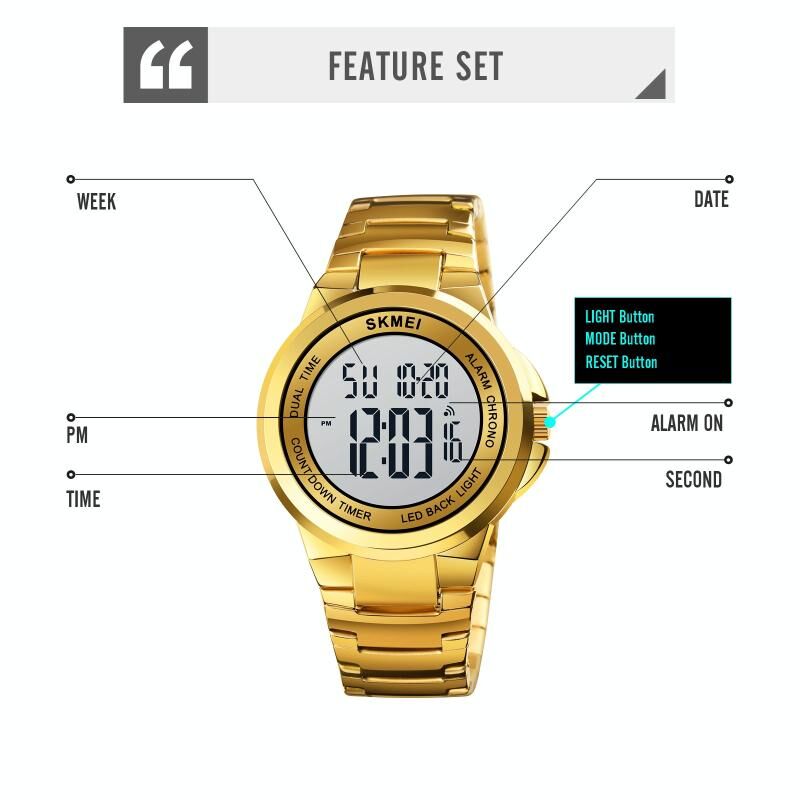 8. Λειτουργίες: διπλή ώρα, χρονομέτρηση, φωτεινότητα, ένδειξη ημερομηνίας, ξυπνητήρι χρονισμού, εμφάνιση ημέρας της εβδομάδας, ωριαία ώρα, σύστημα 12/24 ωρών, αντίστροφη μέτρηση