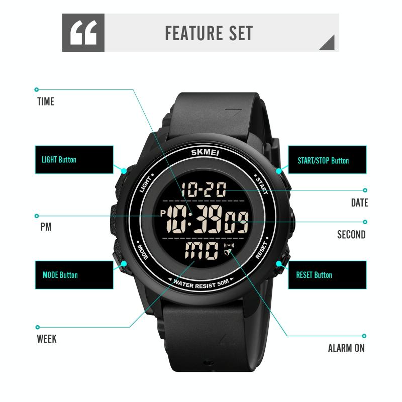 8. Λειτουργίες: ώρα δύο πόλεων, χρονόμετρο, νυχτερινό φως LED, ένδειξη ημερομηνίας, χρονικός συναγερμός, ένδειξη ημέρας της εβδομάδας, ωριαία σήμανση, σύστημα 12/24 ωρών, αντίστροφη μέτρηση