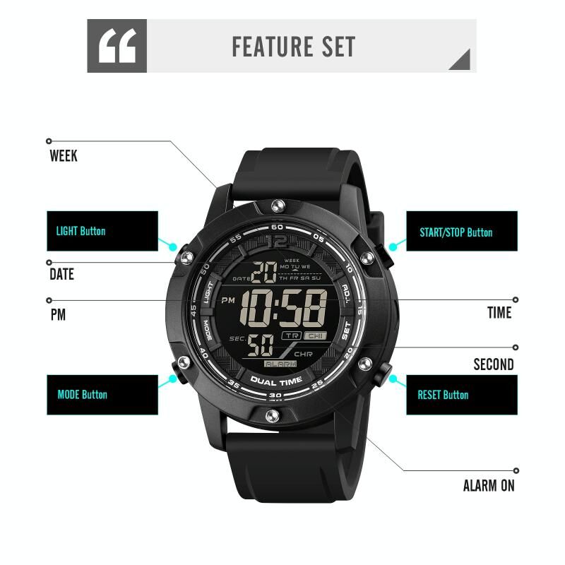 8. Λειτουργίες: διπλή ώρα, χρονόμετρο, φωτεινότητα, ένδειξη ημερομηνίας, ξυπνητήρι χρονισμού, εμφάνιση ημέρας της εβδομάδας, ωριαία ώρα, σύστημα 12/24 ωρών, αντίστροφη μέτρηση