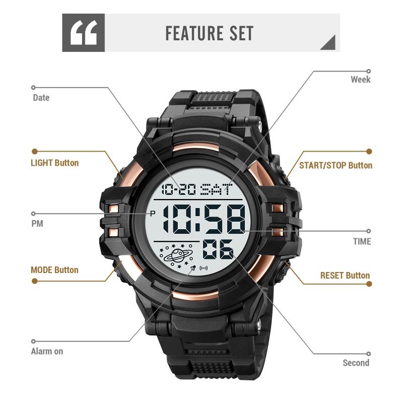 1. Functions: dual time, chronograph stopwatch, hourly timekeeping, day of the week display, timed alarm clock, luminous, 12/24 hour format, countdown