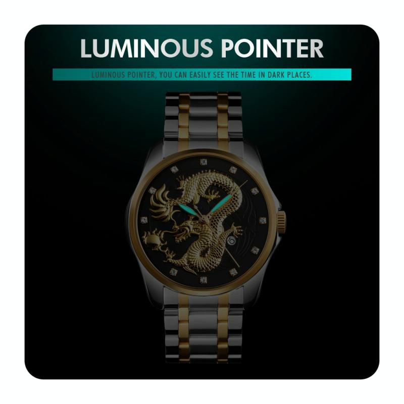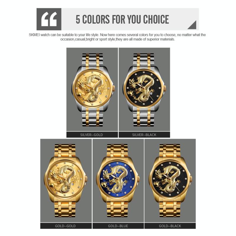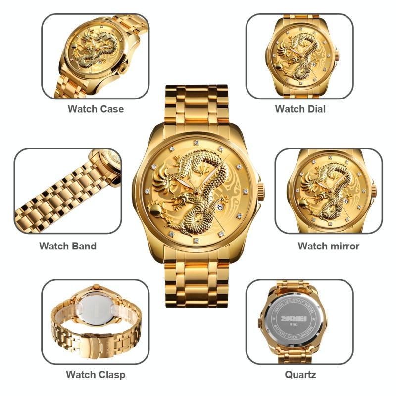 SKMEI 9193 Ανδρικό Χρυσό Ρολόι Quartz με Μοτίβο Χρυσού Δράκου, Ημερολόγιο και Φωτεινούς Δείκτες (Χρυσό-Μπλε) (SKMEI)