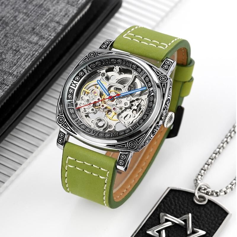 SKMEI 9271 Ανοξείδωτο χάλυβα πόρπη δερμάτινο λουράκι αδιάβροχο μηχανικό ρολόι (μαύρο) (SKMEI)