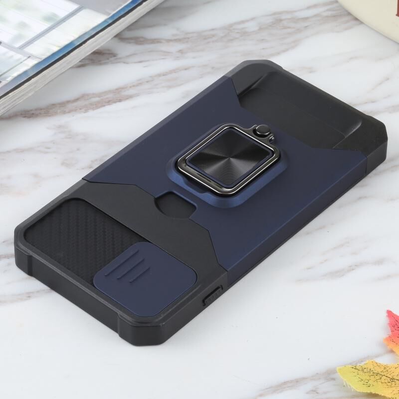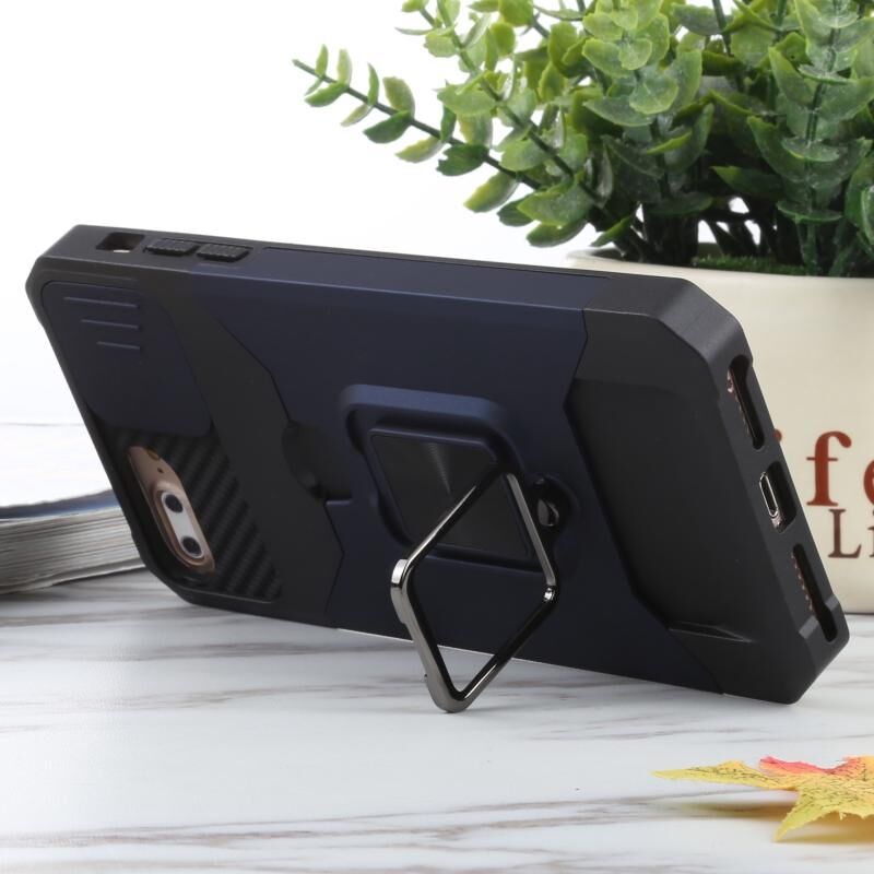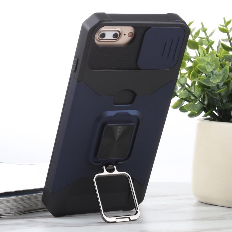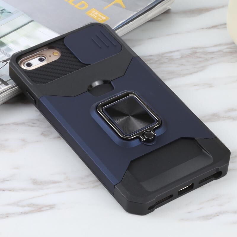 Θήκη PC + TPU ανθεκτική στις κρούσεις με σχεδιασμό συρόμενου καλύμματος κάμερας, βάση δακτυλιδιού & υποδοχή κάρτας για iPhone 8 Plus / 7 Plus / 6s Plus / 6 Plus (Μαύρο)