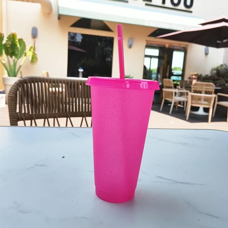 Μικρό καλοκαιρινό γυαλιστερό κύπελλο νερού πλαστικό παγωμένο μπουκάλι ποτού με καλαμάκι (ροζ κόκκινο)