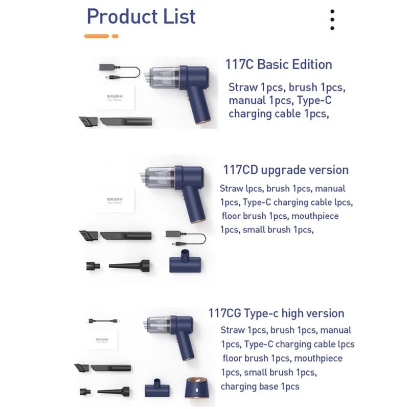 -117CD: Ηλεκτρική σκούπα x 1, καλαμάκι x 1, βούρτσα x 1, εγχειρίδιο x 1, καλώδιο φόρτισης Type-C/USB-C x 1, βούρτσα δαπέδου x 1, επιστόμιο x 1, μικρή βούρτσα x 1
