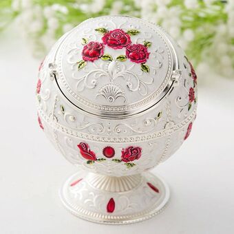 Metal Globe Ashtray With Lid Holiday Gift Tea Table Decoration(Silver Side White Red Rose)