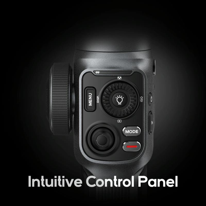3. All your movements and operations are just within your fingertips. Round-cap joystick, optimized control panel and adjustment wheel provide a better experience for users to check and adjust gimbal status while changing camera parameters on the fly.