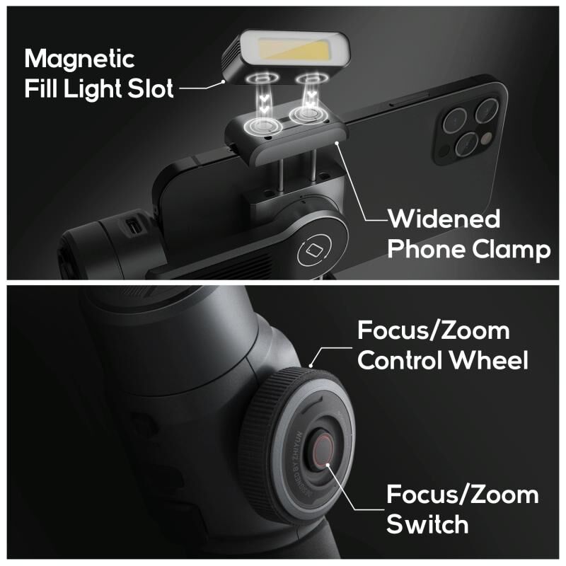 2. Professional magnetic steel motors with upgraded algorithms and wider phone clamp ensure a safer and easier filmmaking experience. Strong compatibility allows mounting a phone even with wide-angle, telephoto, fish-eye and macro lenses.