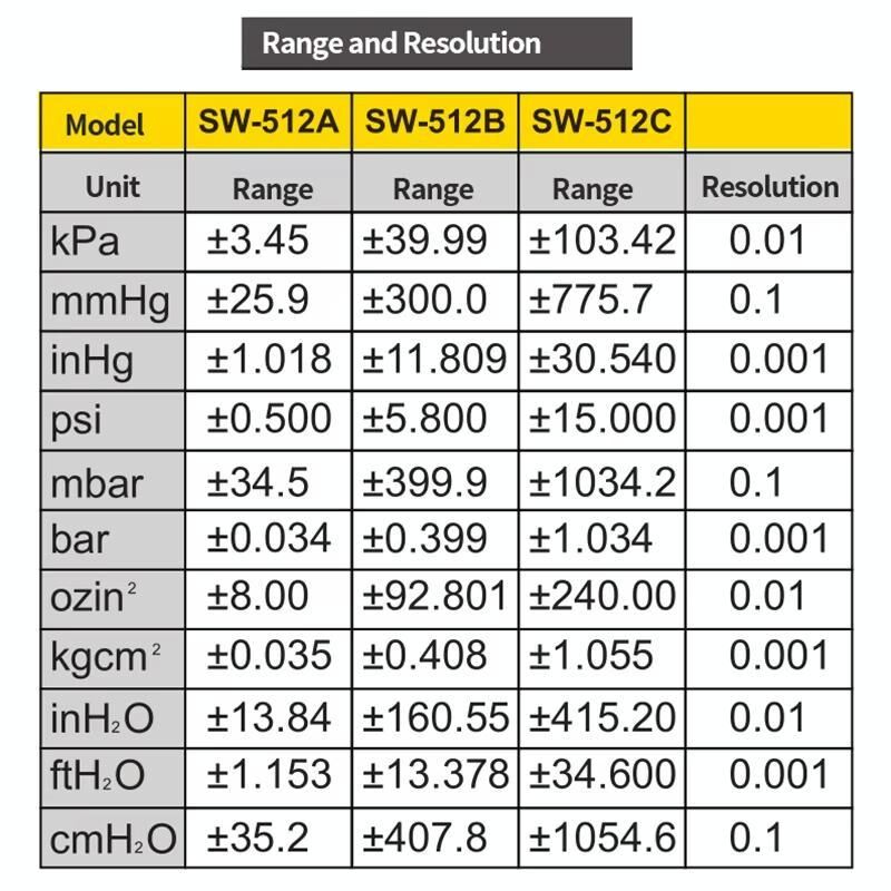 - SW-512B: +/-1%FS, maximum error 400Pa