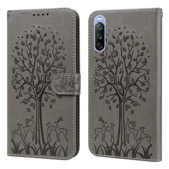 For Sony Xperia 10 III Tree & Deer Pattern Pressed Flip Leather Phone Case(Grey)