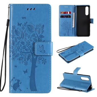 For Sony Xperia5 II Tree & Cat Pattern Pressed Printing Horizontal Flip PU Leather Case with Holder & Card Slots & Wallet & Lanyard(Blue)