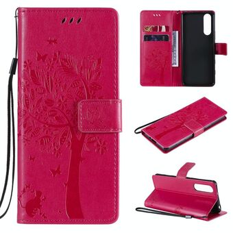 For Sony Xperia5 II Tree & Cat Pattern Pressed Printing Horizontal Flip PU Leather Case with Holder & Card Slots & Wallet & Lanyard(Rose Red)