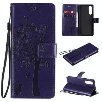 For Sony Xperia5 II Tree & Cat Pattern Pressed Printing Horizontal Flip PU Leather Case with Holder & Card Slots & Wallet & Lanyard(Purple)