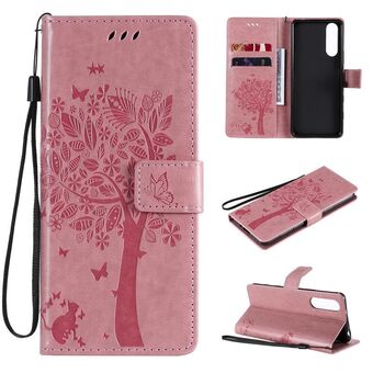 For Sony Xperia5 II Tree & Cat Pattern Pressed Printing Horizontal Flip PU Leather Case with Holder & Card Slots & Wallet & Lanyard(Pink)