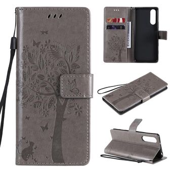 For Sony Xperia5 II Tree & Cat Pattern Pressed Printing Horizontal Flip PU Leather Case with Holder & Card Slots & Wallet & Lanyard(Grey)