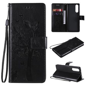 For Sony Xperia5 II Tree & Cat Pattern Pressed Printing Horizontal Flip PU Leather Case with Holder & Card Slots & Wallet & Lanyard(Black)
