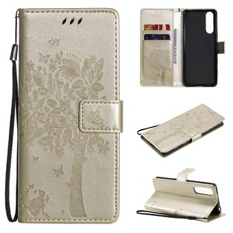 For Sony Xperia5 II Tree & Cat Pattern Pressed Printing Horizontal Flip PU Leather Case with Holder & Card Slots & Wallet & Lanyard(Gold)