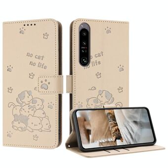 For Sony Xperia 1 IV Embossed Kitten Phone Leather Case with Lanyard(Beige)